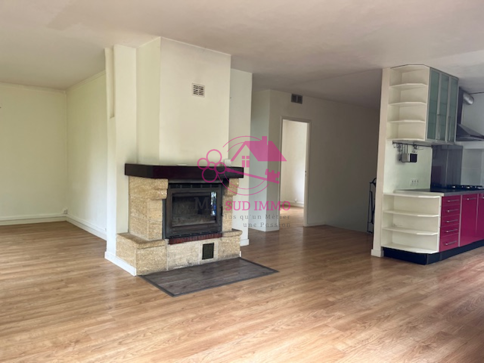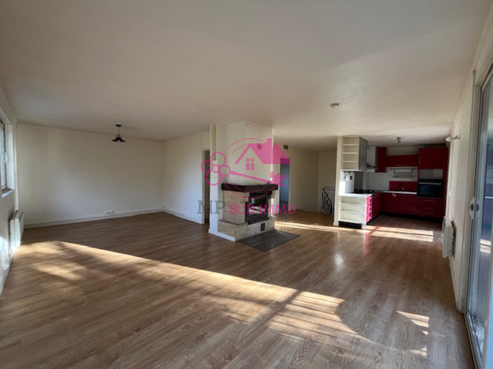 A l'étage un bel espace de vie et sa cheminée, la cuisine ouverte donne sur un balcon filant, une chambre, une salle de bain avec wc.
