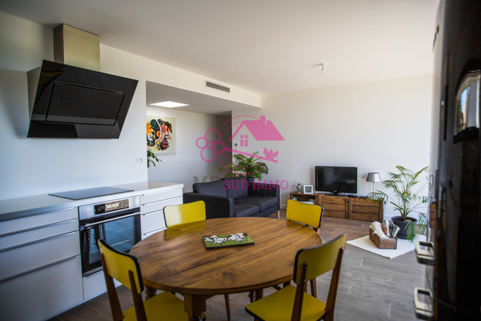 L'espace à vivre de 30 m² comprend le séjour et la cuisine entièrement ouverte équipée et meublée, qui donne accés à un cellier buanderie.