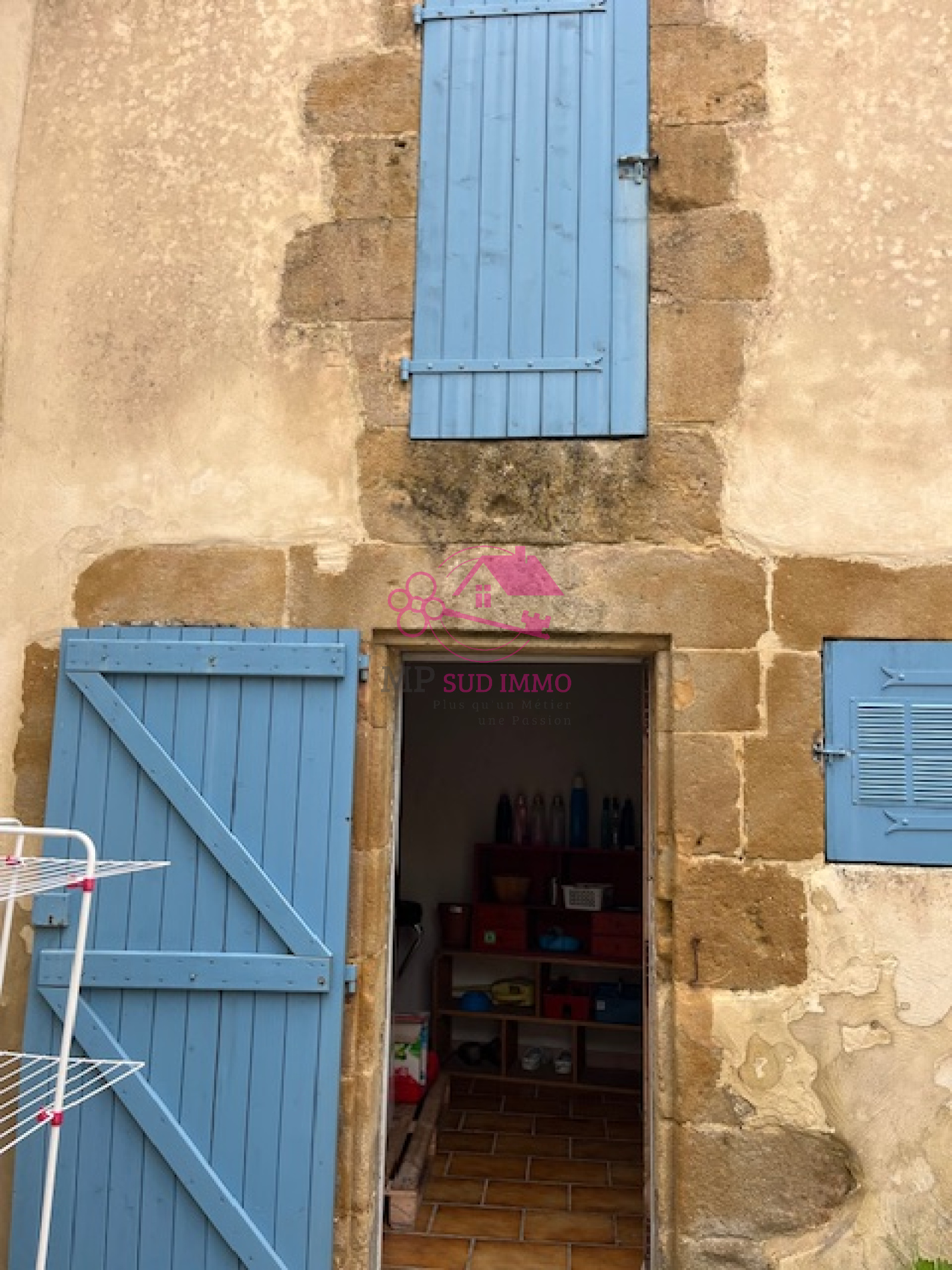 Elle se compose dés l'entrée d'une cuisine équipée et meublée, un séjour en enfilade donnant sur une cour avec un pigeonnier aménagé en buanderie et rangement ainsi qu'un étage.Toujours au rez de chaussée se trouve une petite salle d'eau et un wc indépendant.