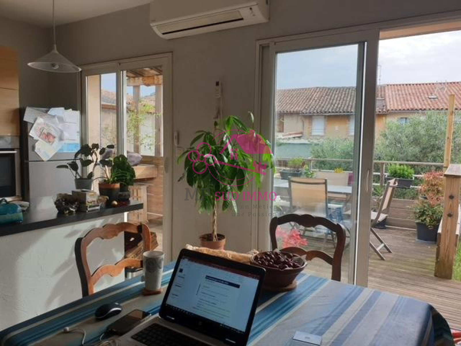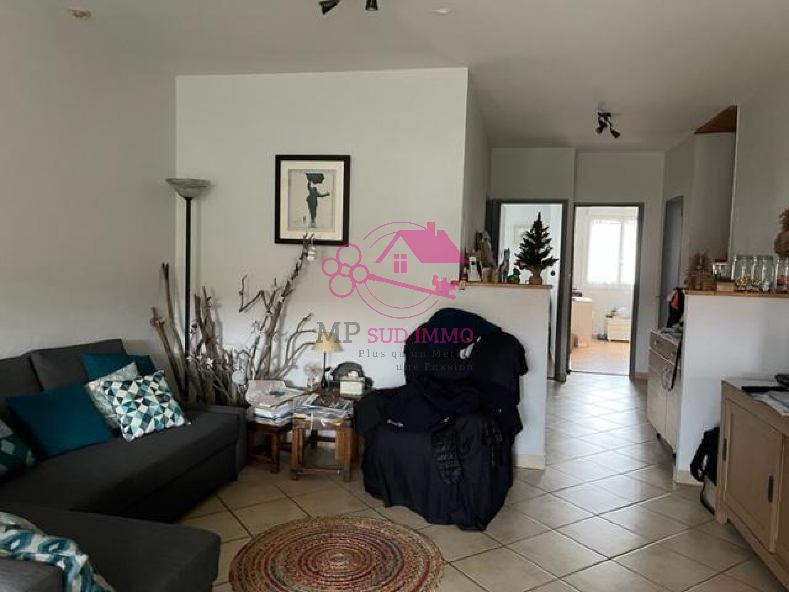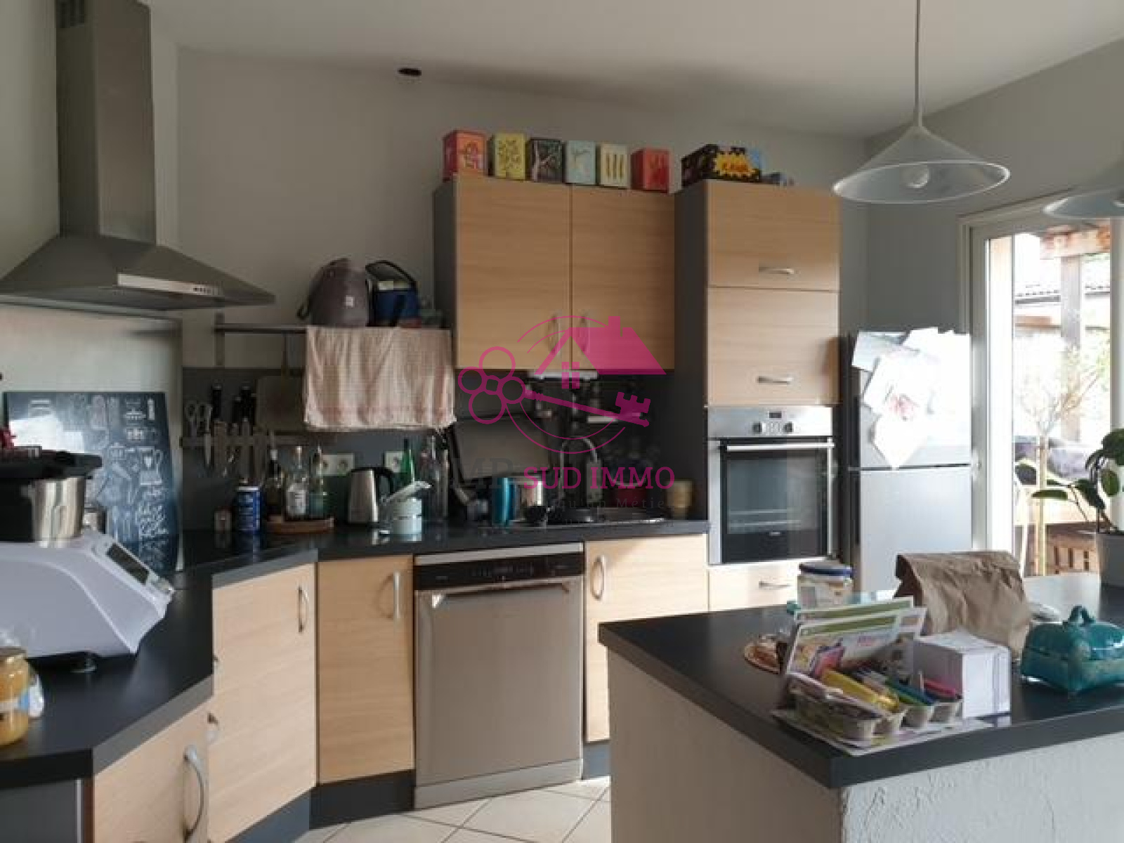 Au premier étage,un palier avec placard, le séjour avec sa cuisine ouverte donnant sur la terrasse, une salle de bains avec baignoire et douche, deux chambres avec placard et un wc.